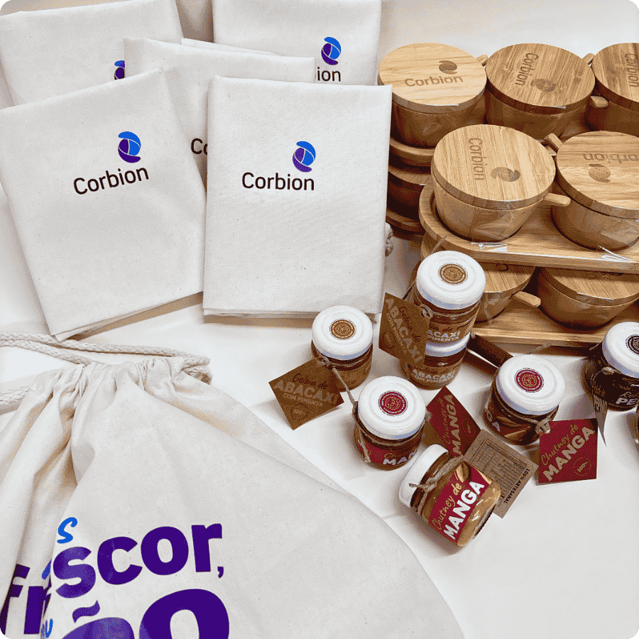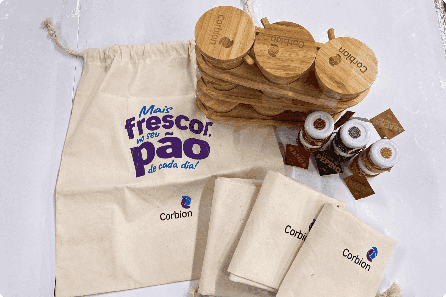 O desenvolvimento dos brindes para a Corbion seguiu um rigoroso padrão de qualidade. Diferente de itens genéricos de catálogo, o projeto focou na personalização exclusiva. A peça central — frequentemente kits de boas-vindas ou presentes de fim de ano — foi concebida para ser útil, durável e esteticamente refinada.