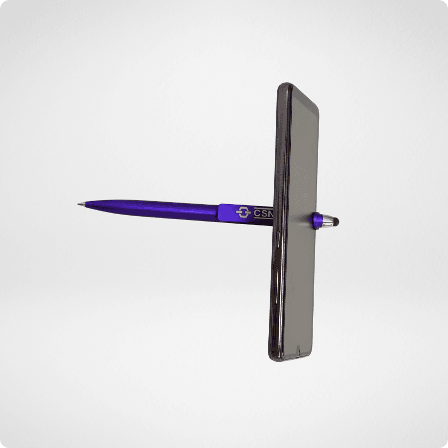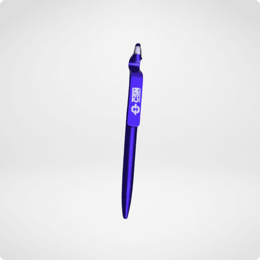 Observa-se ainda que a caneta possui uma ponta stylus (touch), adequada para uso em tablets e smartphones. Isso demonstra, claramente, que a CSN está conectada com a tecnologia e a modernidade, oferecendo uma ferramenta útil tanto para o papel quanto para o mundo digital.
