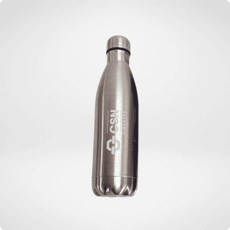 Por outro lado, a garrafa de alumínio prateada, com seu acabamento escovado, transmite uma sensação imediata de robustez e modernidade. Diferente de garrafas plásticas comuns, este item reforça o compromisso da empresa com a sustentabilidade, incentivando, consequentemente, a redução de copos descartáveis.