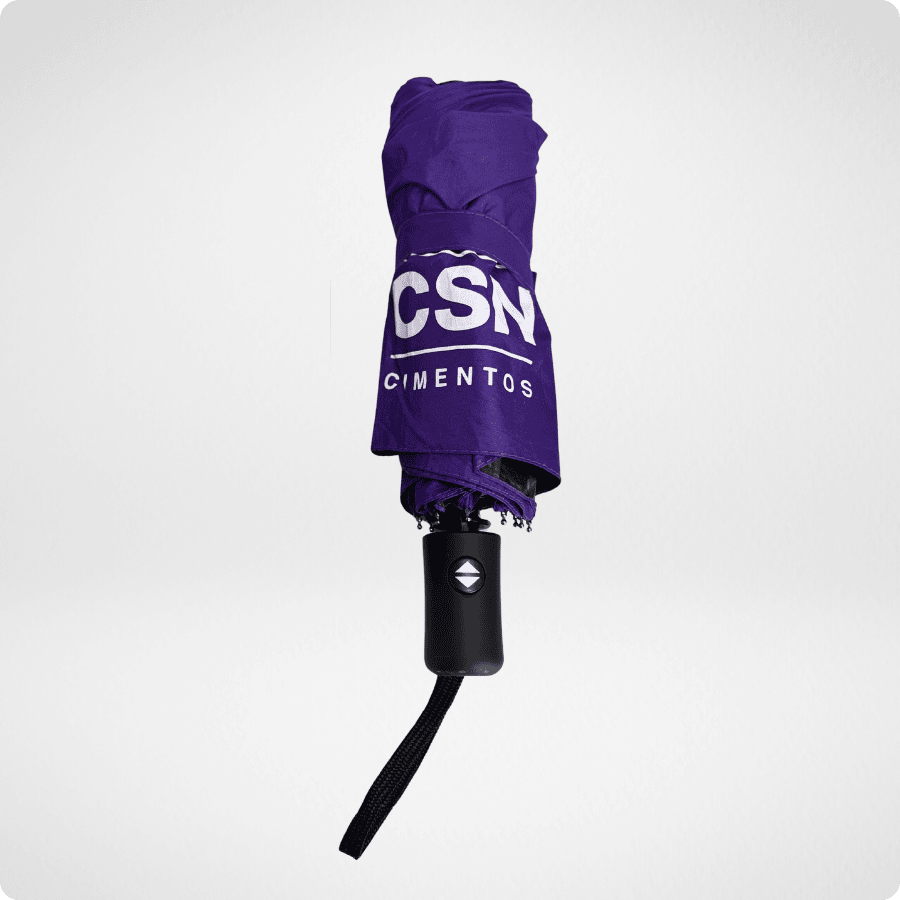 O guarda-chuva é, indubitavelmente, um dos brindes com maior área de exposição de marca. No modelo produzido para a CSN, a cor roxa vibrante destaca-se imediatamente em meio à multidão, garantindo visibilidade até mesmo em dias cinzentos.