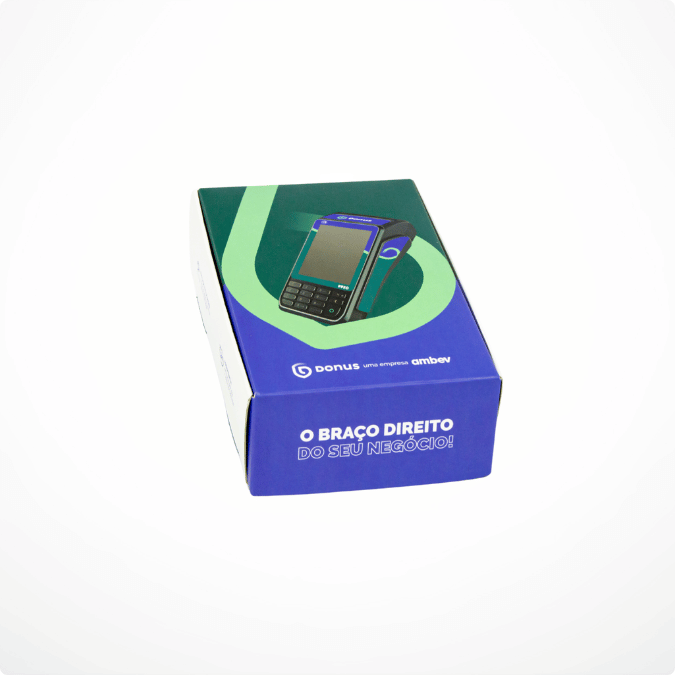 O design da caixa para Donus utiliza as cores institucionais (azul e verde) de maneira estratégica, garantindo que a marca seja imediatamente reconhecida. Além disso, a embalagem é projetada com um berço interno, que não só protege a máquina de cartão contra impactos, mas também organiza acessórios.