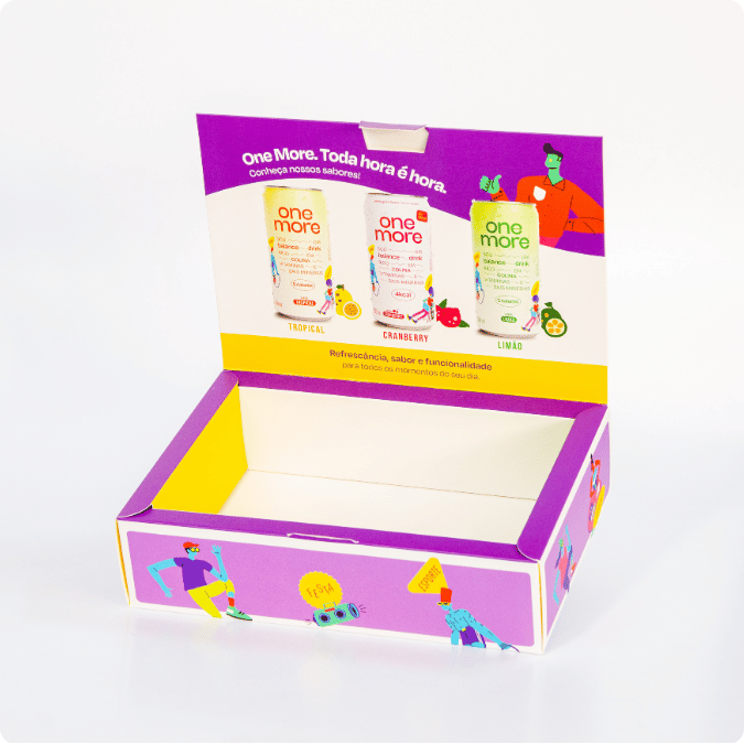 - Experiência de Unboxing: A caixa foi projetada para revelar o produto de forma atrativa. Ao abrir a tampa, o consumidor é recebido pela mensagem “One More. Toda hora é hora” e uma apresentação visual das latas (Tropical, Cranberry e Limão) impressas no interior da tampa.