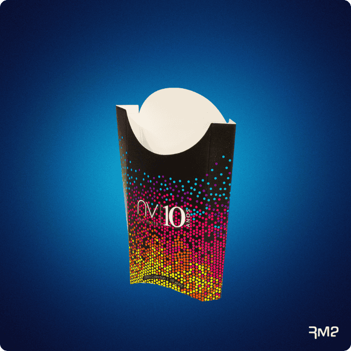 A RM2 trabalha com papéis certificados e revestimentos de grau alimentar que impedem que o óleo da batata penetre no cartão, preservando a integridade da embalagem e evitando acidentes no transporte. A embalagem precisa ser um isolante térmico, mantendo o produto quente pelo máximo de tempo possível. Por fim, a impressão de alta qualidade, com o padrão de pontos coloridos vibrantes (NV10), reforça a ideia de que a embalagem é uma peça de marketing em movimento.